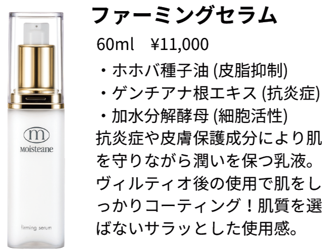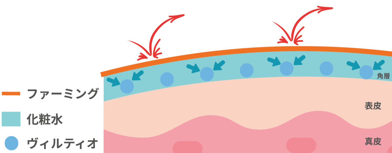 次にバリア機能の強化ですが、ヴィルティオと乳液のW使いがとても効果的です。ヴィルティオはセラミド3がたっぷり配合され水分保持力が高く、細胞間脂質と同じような成分で作られているので、角質を修復し保湿した化粧水や美容液を肌にキープする働きがあります。そこに保湿・エモリエント・抗炎症成分配合のファーミングセラムでフタをすれば、肌の水分を逃さない頑丈なバリアの完成です!乳液を単体で使うよりも、ヴィルティオと乳液でWコーティングした方が肌内部の水分蒸発量が3%しか減らなかったという実験結果もあります。