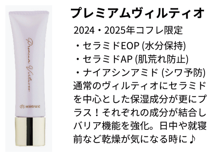 さらに、12月は昨年大好評だったプレミアムヴィルティオもコフレで再販売されます!ヴィルティオに保湿成分を更にプラスした最強アイテムなので、手に入れられた方は贅沢な保湿アプローチを今年もご堪能下さい!